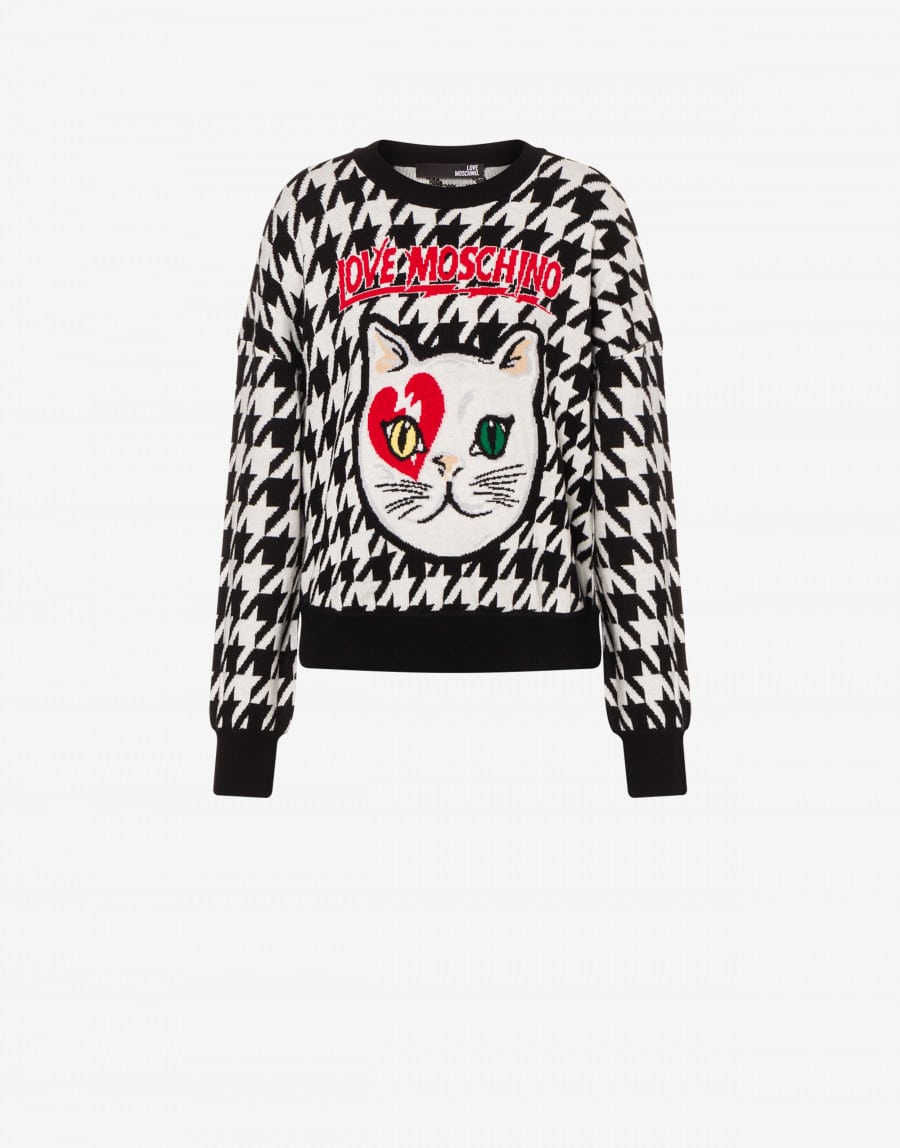Fashionable women’s Bowie Cat jacquard sweater from Love Moschino featuring a jacquard effect, a houndstooth pattern, ribbed details, a round neck and long sleeves.
