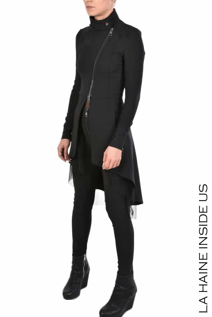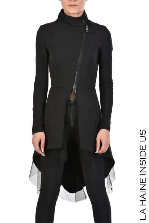 This Tecno strech duster Jacket has an asymetric cut in assemblance with its automatic buttons & double slider zip closure and textural layers it creates an impression made to last